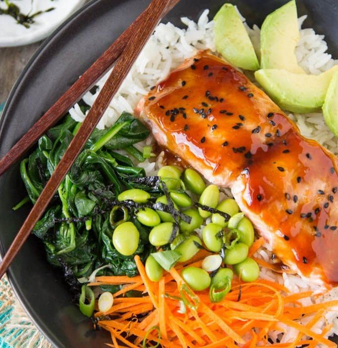 - To assemble bowls, heat up cooked rice and divide between bowls. Top with salmon, spinach, carrot, edamame, avocado, sesame seeds, green onions and Nori strips. Drizzle any remaining teriyaki sauce over bowl if desired.