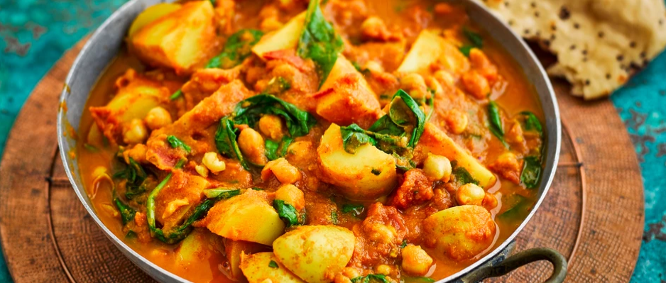 - Season and add the potatoes and chickpeas along with 1⁄2 a tin of water and simmer for 30 minutes until thickened and the potatoes have cooked through. Add the spinach and cook for a few minutes to wilt.